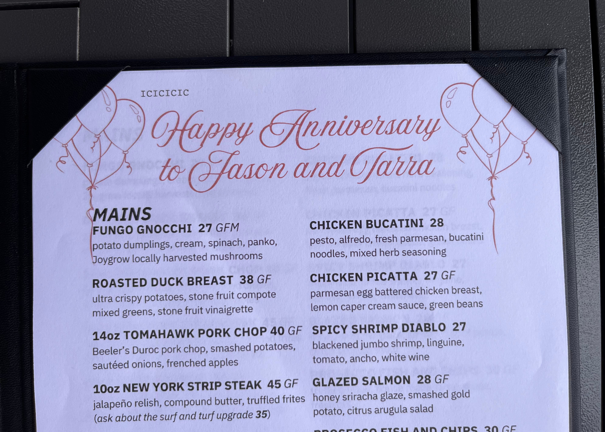 Aura has a modern yet welcoming vibe that feels celebratory the moment you walk in. Soft lighting, stylish décor, and an energy that balances sophistication with comfort set the perfect tone for our evening. And right away, the staff made us feel like more than just guests — they made us feel celebrated. Waiting at our table were menus personalized with “Happy Anniversary Jason & Tarra” printed across the top. It was such a thoughtful, unexpected touch that immediately set the evening apart.