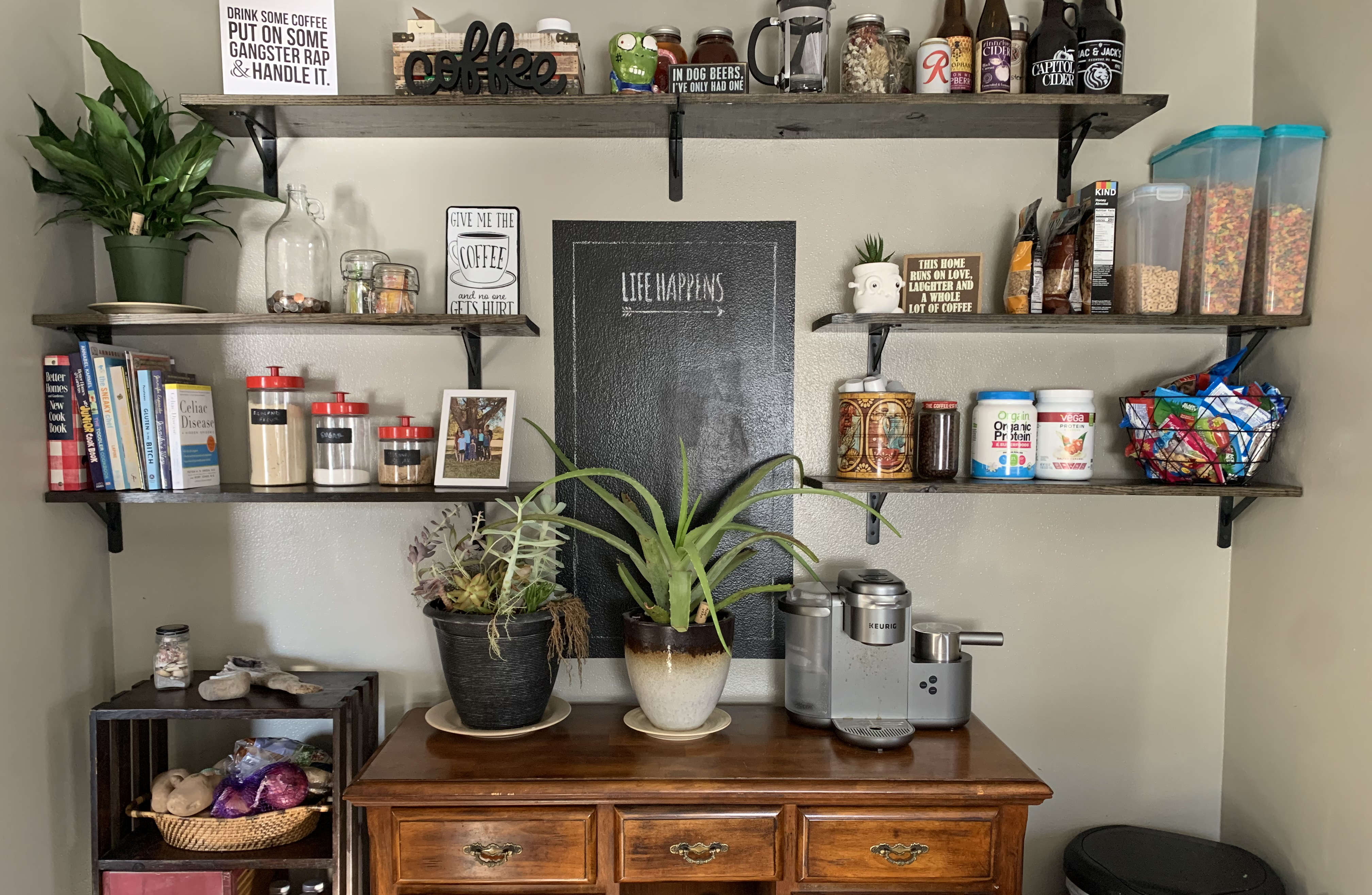The transformation speaks for itself. The once-empty wall is now a beautiful open pantry and coffee station, complete with shelves that hold everything from cereal and spices to plants and cookbooks.