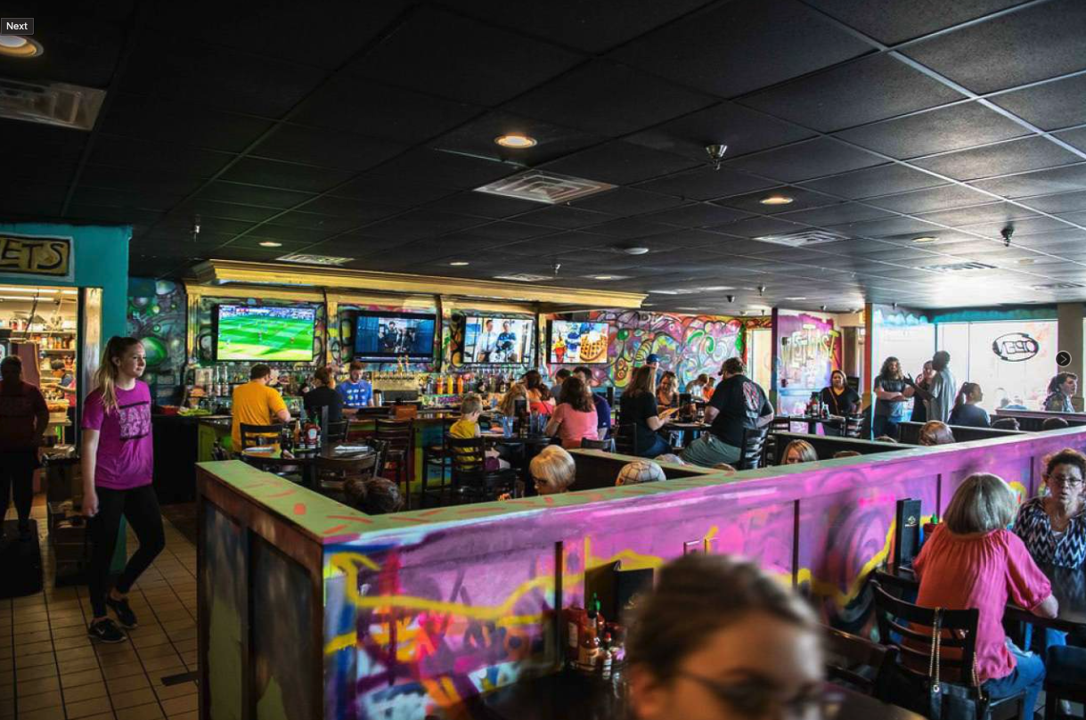 The interior is bold and colorful, covered in graffiti-style murals and retro decor, with a killer
