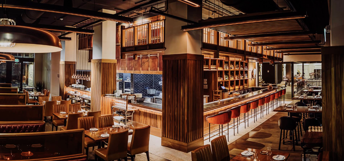 The interior centers around a striking 26-foot zinc bar with hidden taplines and glass shelving, and showcases an open‐hearth kitchen with a Spanish-imported wood‐fired charbroiler as its heart. Subtle lighting, leather banquettes, and stylish textiles balance the grandeur with comfort, making it feel both timeless and cozy.